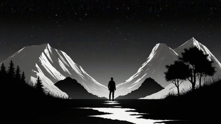 Person Walking Alone in Monochrome Mountainous Landscape at Night