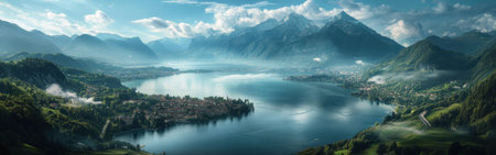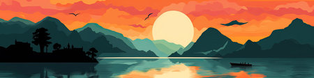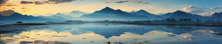 Panoramic view of the lake at sunset with mountains in the background with AI-Generated Images