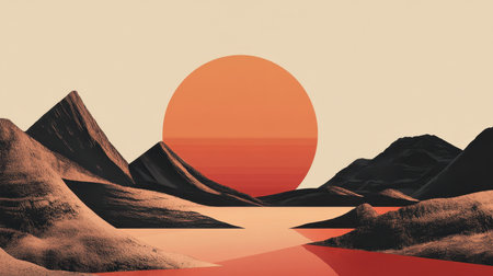 An abstract geometric landscape with a large orange sun in the sky above black and brown mountains and a red water lake.