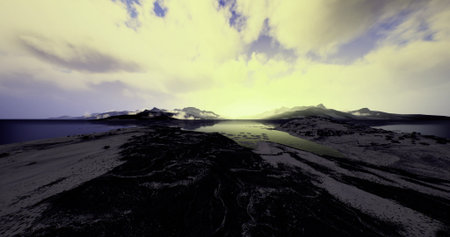 Fantasy mountain landscape with lake and sunset sky