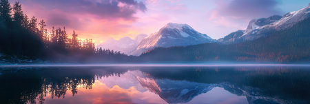 Vast landscape showcases a serene lake surrounded by mountains. Soft pastel colors fill the sky as the sun sets, creating a tranquil atmosphere. Nature reveals its beauty at dusk.