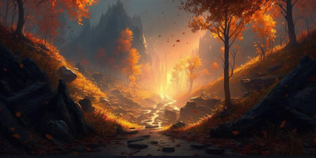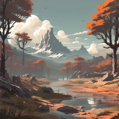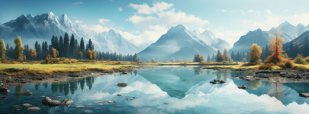 Beautiful autumn landscape with lake and mountains. Digital painting.