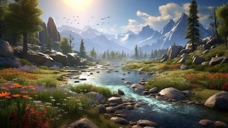An AI generated illustration of an idyllic landscape featuring an array of lush green trees, jagged mountains and sun-kissed rocks