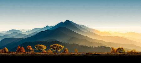 The sun rises softly behind a majestic mountain, casting a warm glow over the misty valleys. Layers of blue and orange hues blend in the sky, creating a tranquil atmosphere in nature.