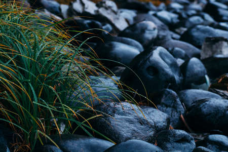 Discovering the beauty of green moss covering rugged rocks by the waters edge