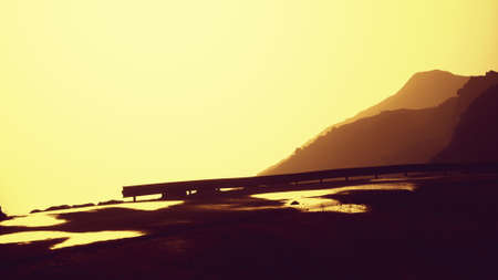 Mountain landscape with fog at sunrise. Natural background. Toned.