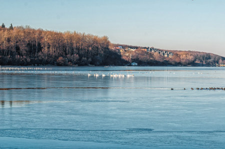 Beautiful swans, ducks, seagulls swim in the winter on the river
