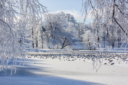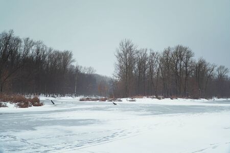 Winter park landscape with a river. Russian landscapes. Winter season, cold season. Snow picture