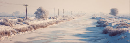 A serene river is blanketed in frost, reflecting the soft morning light, while power lines stretch along the frozen banks in a tranquil winter setting.