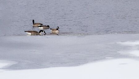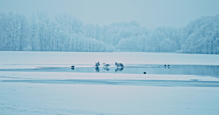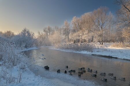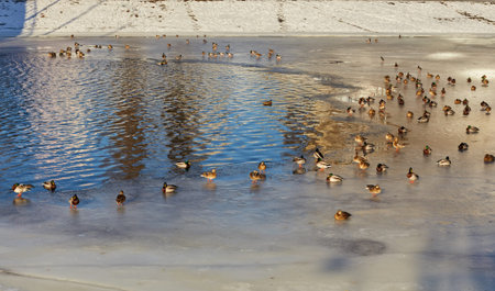 Birds resting on frozen lake surface. Ducks swimming in a freezing winter river. Winter water landscape.