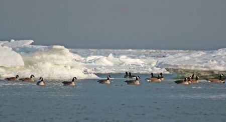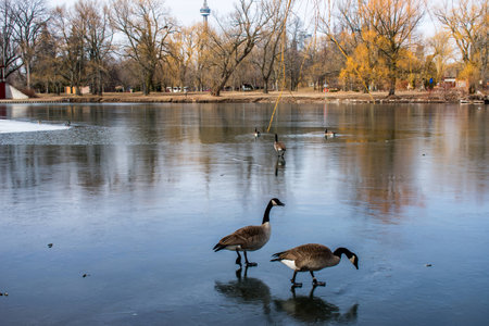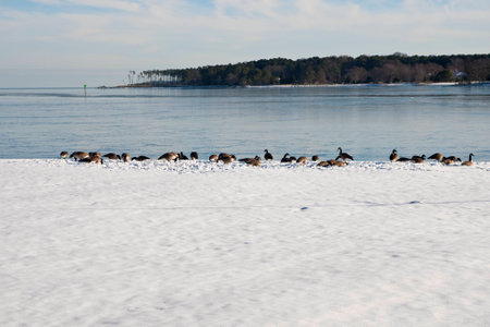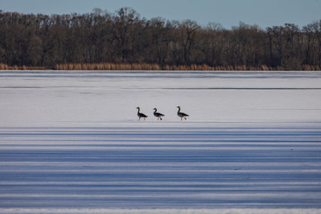 A group of wild geese walking on a frozen pond during a sunny winter day. Natural scenery with a forest in the background.