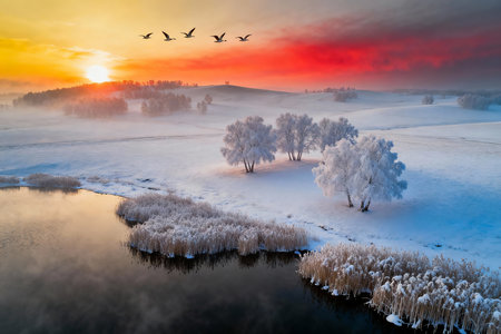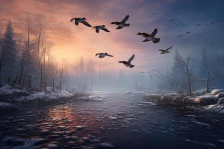 Flock of ducks flying over a frozen lake at sunset, winter time,Wild ducks flying over a frozen river, AI generated