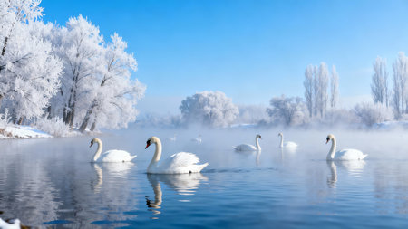 Picturesque winter scenic of thick covering of snow and swans on frozen pond.