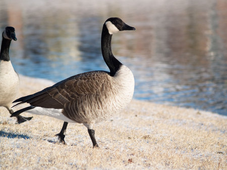 A pair of Canada geese stand gracefully on an icy surface beside tranquil water, embodying the beauty of winter's serene landscape and avian wildlife.