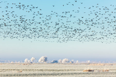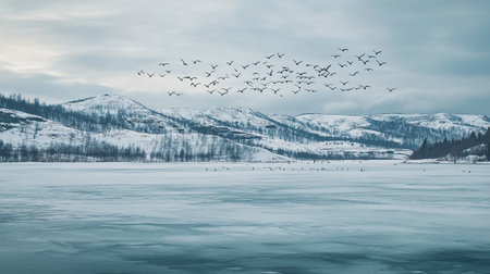 Flock of birds flying over frozen lake in winter, Alaska, USA