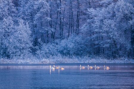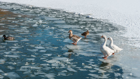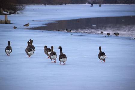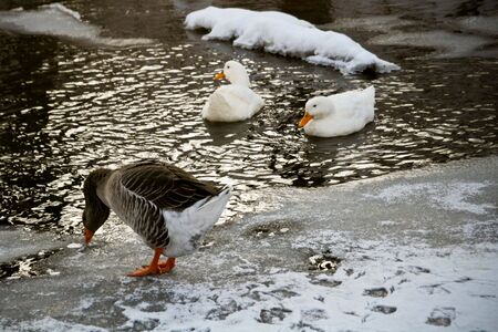 The fowl on frozen lake. Wild geese, swans, ducks are standing on ice in winter freeze day. Winter scene, white and blue colours. Still nature.