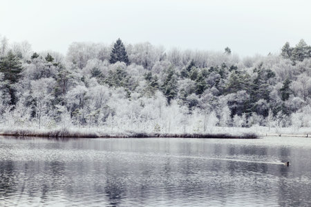 Frozen pond surrounded by frost-covered trees in a winter landscape