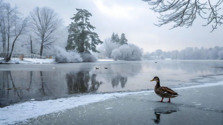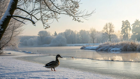 A lone duck stands on the snowy bank of a partially frozen lake, surrounded by a tranquil winter landscape. The scene is serene and peaceful.