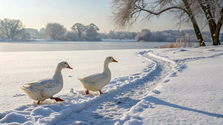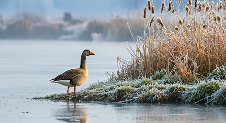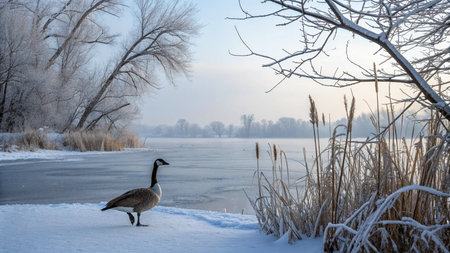A majestic goose stands on a frosty shore, surrounded by serene winter scenery. The soft morning light creates a peaceful ambiance by the calm water.