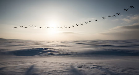 A flock of birds flies in a V-formation across a vast, snowy winter landscape under a soft sun. The minimalist image conveys themes of migration, freedom, teamwork, and the changing seasons.