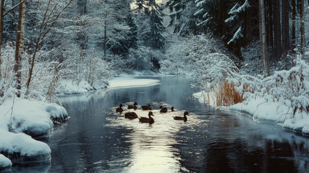 A family of ducks swimming in the unfrozen section of a river in a snowy forest.