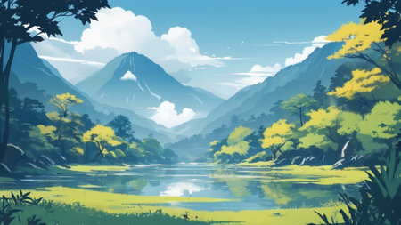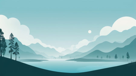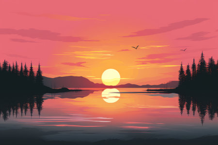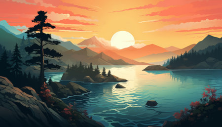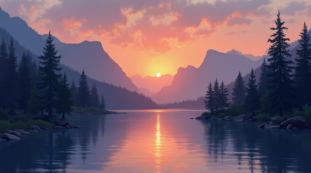 Illustration of a mountain lake at dawn surrounded by a pine forest. Generative AI.