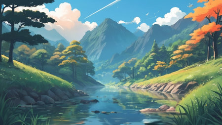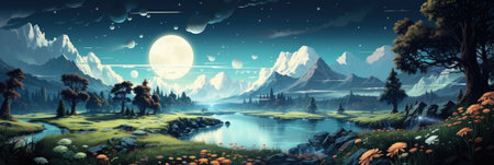 Fantasy landscape with mountains, meadow and river. Digital painting.