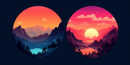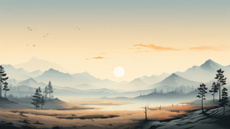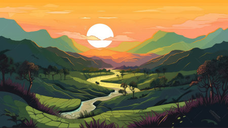 Illustration of dawn in the mountains. A picturesque view of the valley. Generative AI