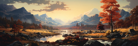 Fantastic autumn landscape with lake and mountains. 3d rendering