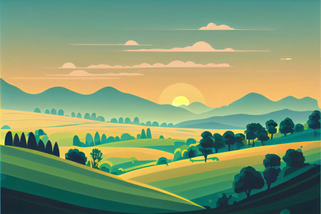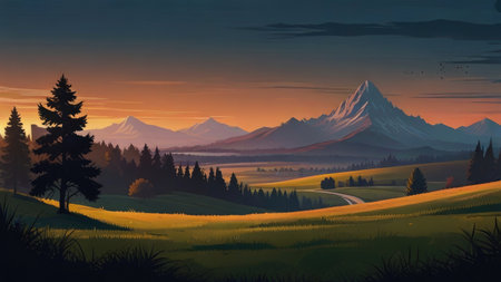 A digital painting depicts a tranquil sunset scene over a majestic mountain range with a foreground of rolling green hills and a winding road.