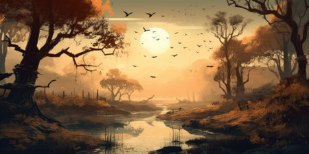 A breathtaking landscape painting depicts a glowing sunset casting warm hues across a tranquil river. Fiery red trees frame the scene, their reflections shimmering in the water.