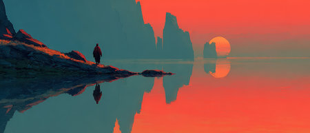 A solitary figure stands by the shore reflecting on the serene water as a vibrant sunset paints the sky in shades of orange and pink.