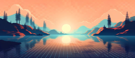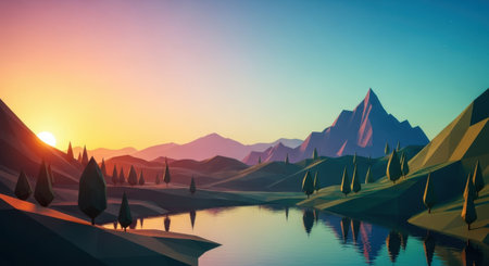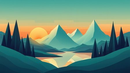 A sharp, minimalistic abstract landscape depicting mountains, tall pine trees, and a serene lake reflecting the beauty of a tranquil sunrise, expressed in cool and warm hues.