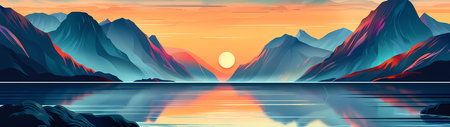 A striking panoramic view of vibrant mountain peaks under a fiery sunset sky, reflected in the serene waters below. Ideal for use in any project that aims to inspire awe and wonder through nature is grandeur.