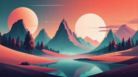 Futuristic landscape with mountains and a lake. Vector illustration.