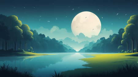 A serene night scene with a full moon illuminating a tranquil lake surrounded by lush trees.