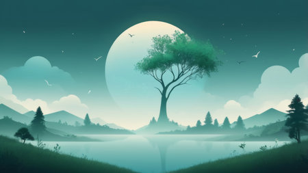 Tranquil landscape with a lone tree and a large moon in the sky.