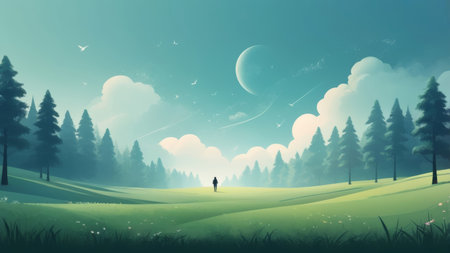 A lone figure stands in a dreamy forest clearing, surrounded by lush greenery and a sky filled with wispy clouds.