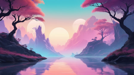 Fantasy landscape with lake and mountains at sunset. 3d illustration