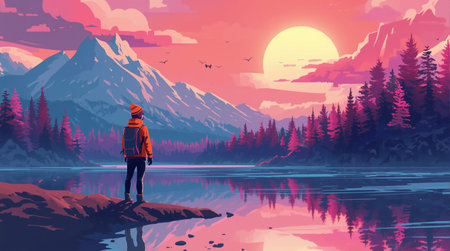 A stylized digital landscape showing a person in a red jacket standing by a calm lake surrounded by pine forests and snow-capped mountains. The sky is filled with swirling clouds in pink, orange, and purple hues, evoking a sense of adventure and tranquility.
