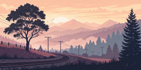 A digital painting depicting a tranquil sunset scene over rolling hills and mountains, featuring a winding road and silhouetted trees.