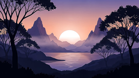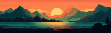 Sunset illustration with sea and mountains. AI generative.