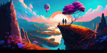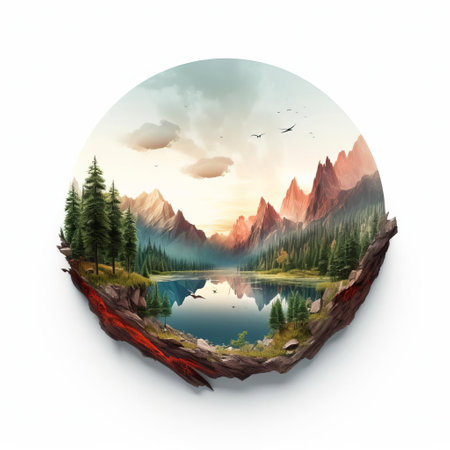 a mesmerizing landscape illustration featuring a solitary, circular ring floating off-center within the frame. the pristine white background emphasizes the vibrant hues and intricate details of the ring, while the off-center composition creates a sense of balance and visual intrigue. ai generated