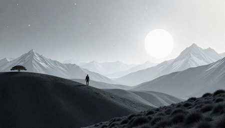 Person Walking Alone in Monochrome Mountainous Landscape at Night