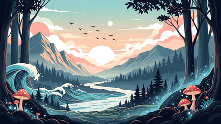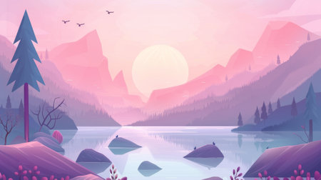 Modern cartoon illustration of nature scenery with lake, mountains, trees and birds in pink sky. Modern cartoon illustration of coniferous forest on river shore, rocks, clouds above water and birds.
