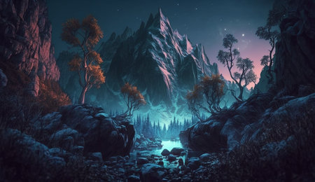 Fantasy landscape with mountains and lake at night.