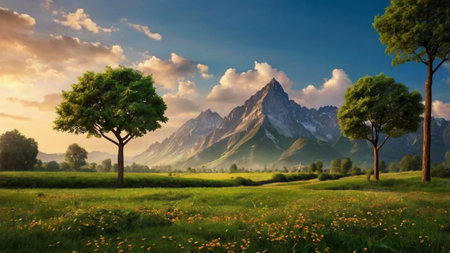 a breathtaking scenery landscape featuring majestic mountains basking in the warm glow of the sun. this photo captures the essence of a playstation 5 screenshot, with impressionist-landscapes and photo-realistic details. the 32k uhd resolution brings out the beauty of the minimalistic serenity, creating a cabincore vibe that could easily grace the pages of national geographic. ai generated