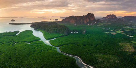Golden Sunset Panorama Of Krabi Coastline With Mangrove River And Tropical Highlands