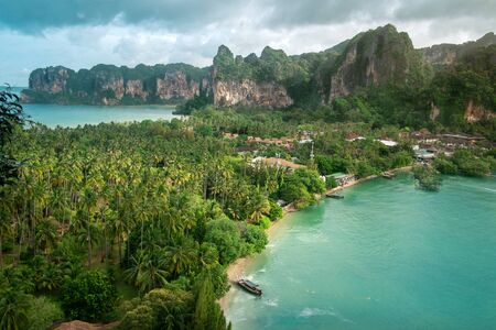 Aerial view of tropical island, rocks and palms, Railay beach, Krabi, Thailand. Tourism in Asia