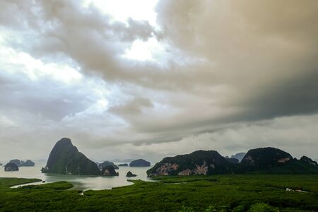 Mountain view sunrise of Phang Nga Bay at Samet Nang She Viewpoint, Phang Nga, Thailand. The famous landmark and famous travel destination.